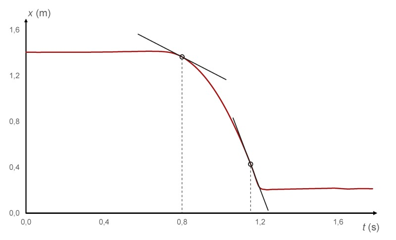 Koska (t, x)-kuvaaja muuttuu jyrkemmäksi ajan kuluessa, niin pallon vauhti kasvaa
