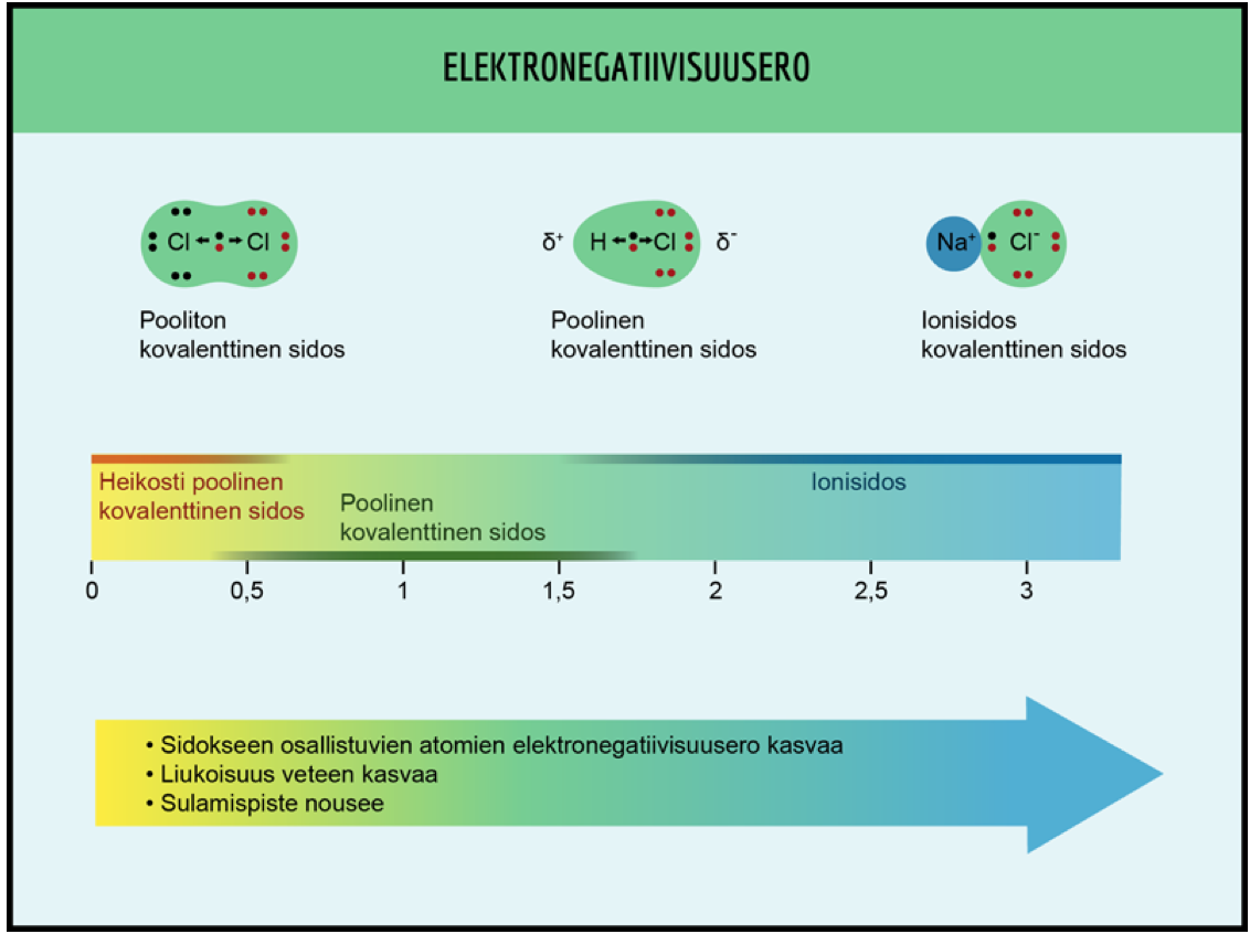 Sidoksen poolisuus määräytyy sen perusteella, kuinka suuri sidokseen osallistuvien atomien elektronegatiivisuusero on.