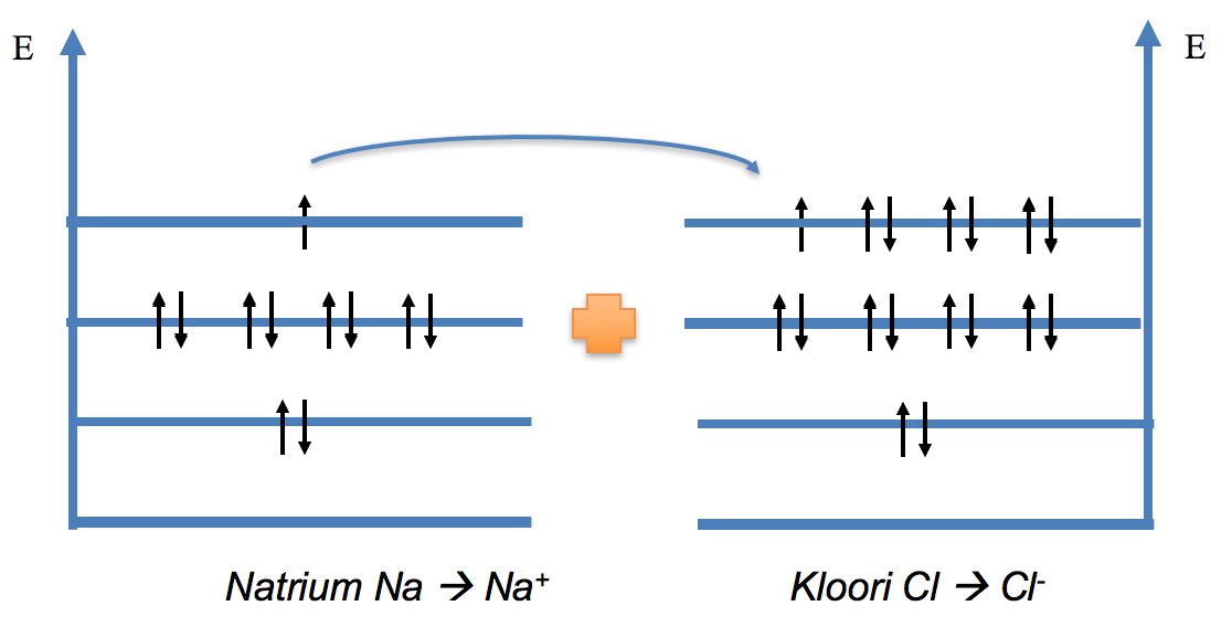 Natrium-atomi luovuttaa elektronin kloori-atomille; molemmat saavuttavat jalokaasurakenteen ja syntyy kaksi vastakkaismerkkistä ionia, jotka sitten vetävät toisiaan puoleensa