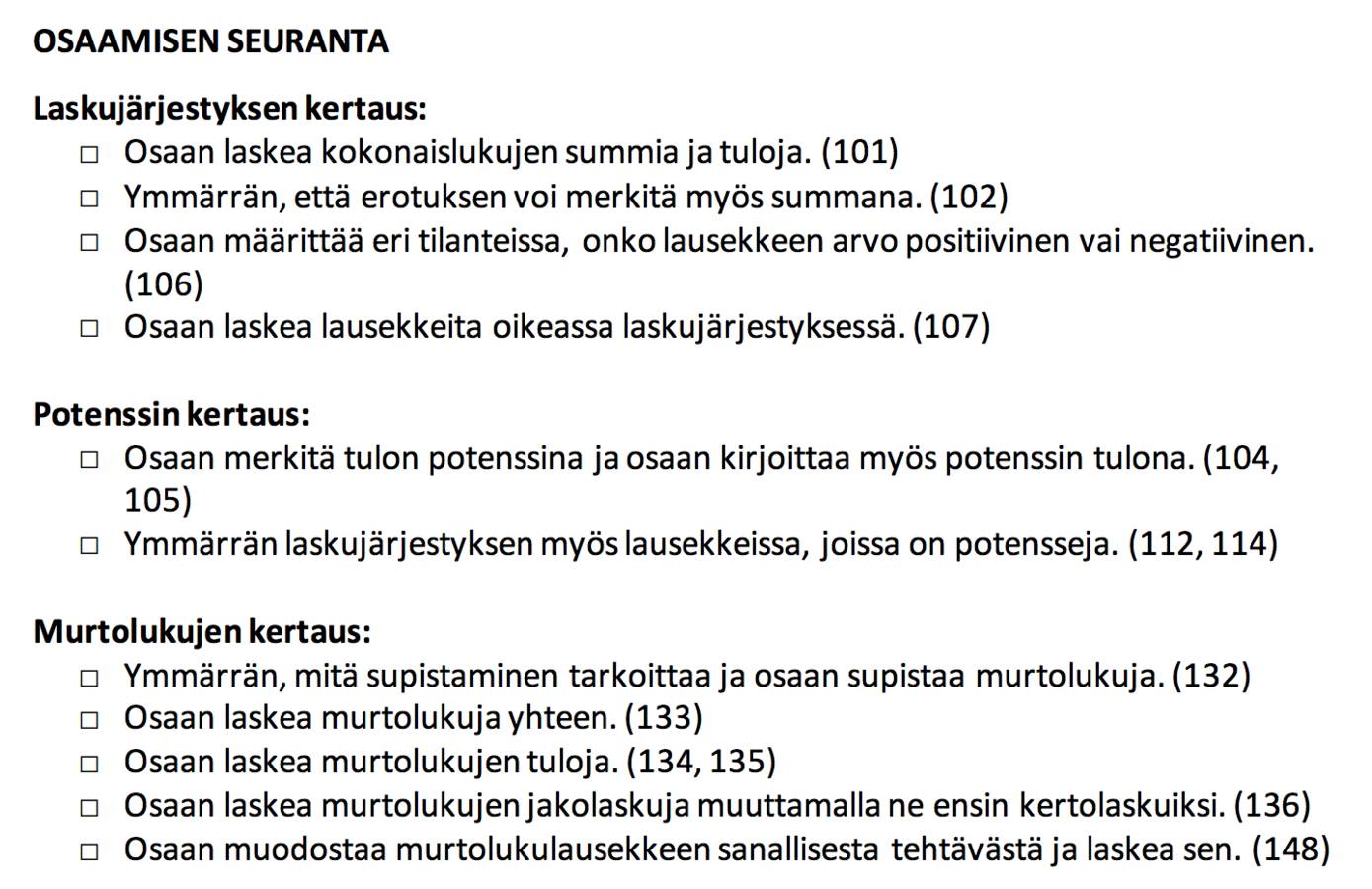 "Oppilaiden matematiikan osaamista ja taitojen kehittymistä seurataan jatkuvasti yhdessä oppilaiden kanssa. Oppilaille korostetaan asioiden ymmärtämisen tärkeyttä. Oppilaita tuetaan suurempien asiakokonaisuuksien hahmottamisessa ja yhteyksien löytämisessä. Eriyttämisessä otetaan huomioon jokaisen oppilaan osaaminen ja annetaan mahdollisuus onnistumisen elämyksiin."