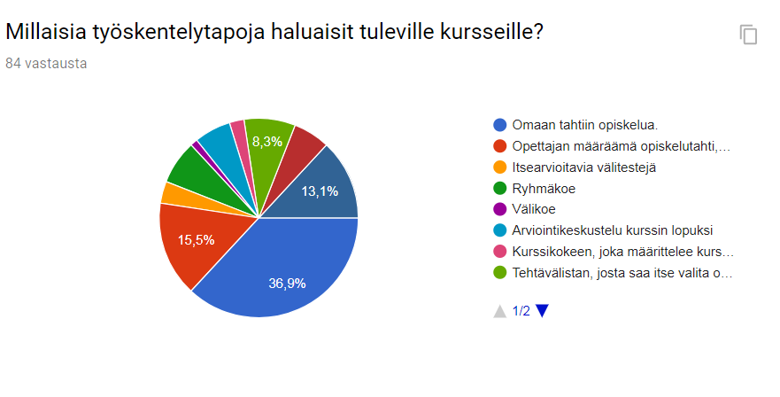 "Tällä kurssilla ollut opetustapa oli mielestäni hyvä, mutta siihen voisi lisätä enemmän opettajajohtoista opetusta ja ehkä joku ryhmän yhteinen rytmi olisi hyvä olla, mutta että kuitenkin saisi tehdä aikalailla omaan tahtiin."