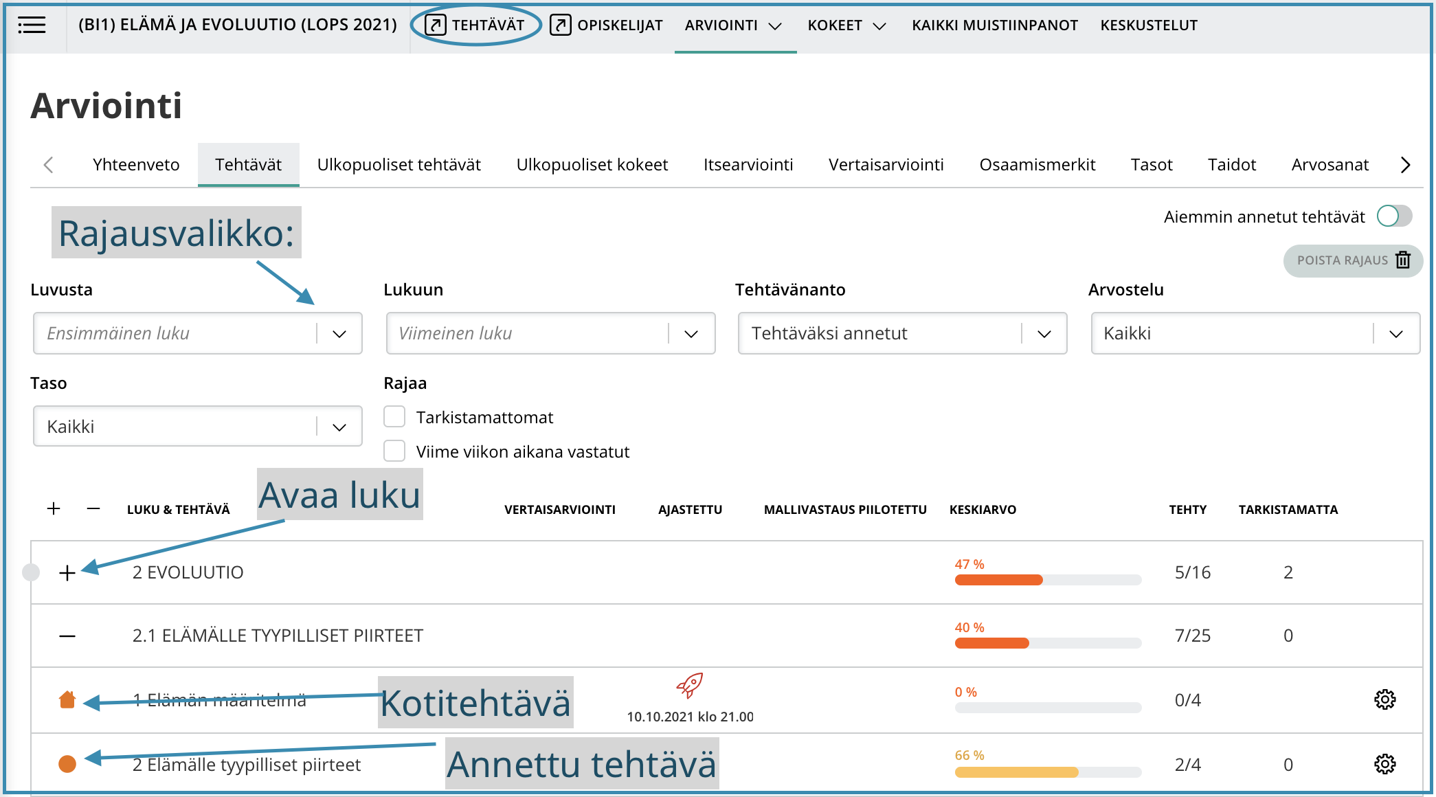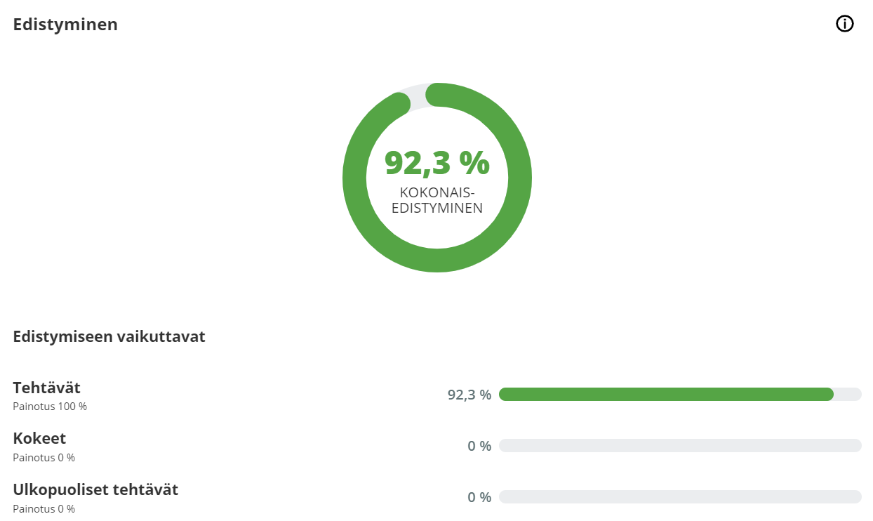 Detailed progress of what the student has done and what type of assigments.