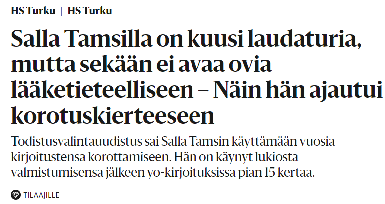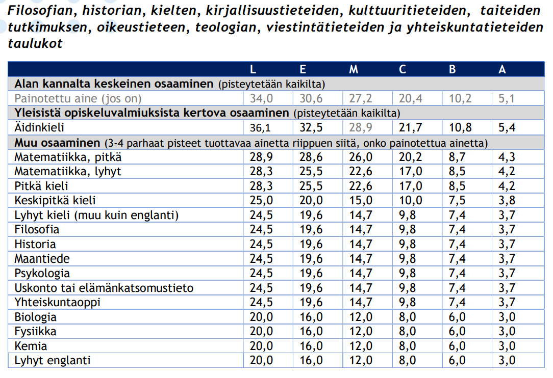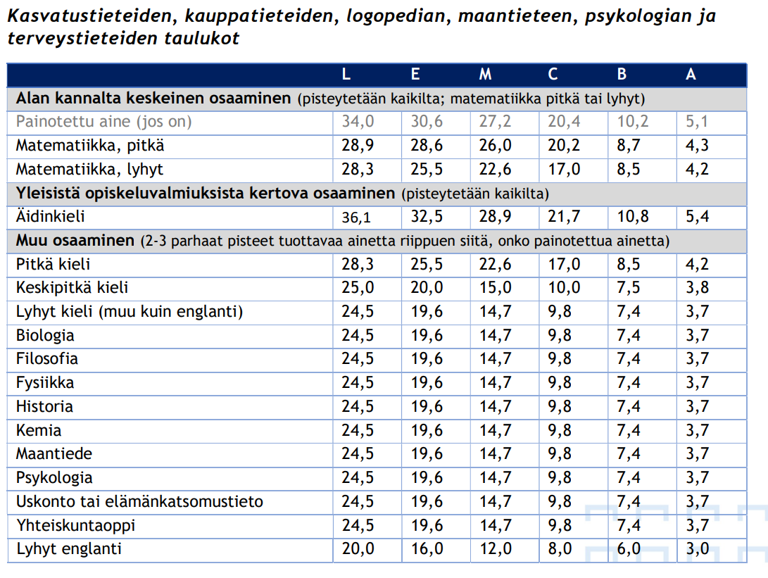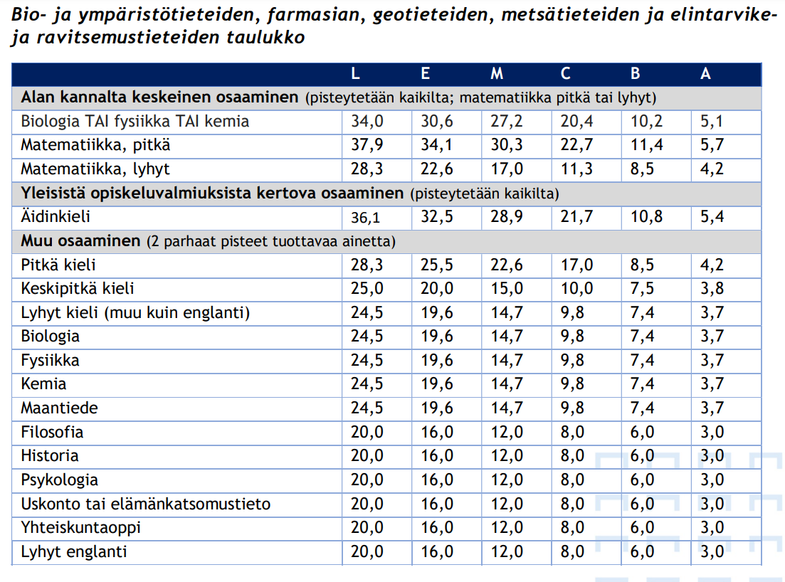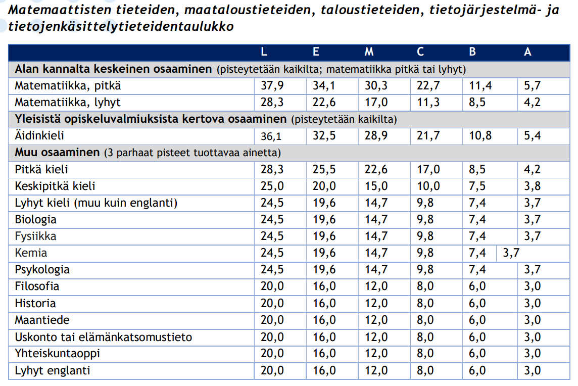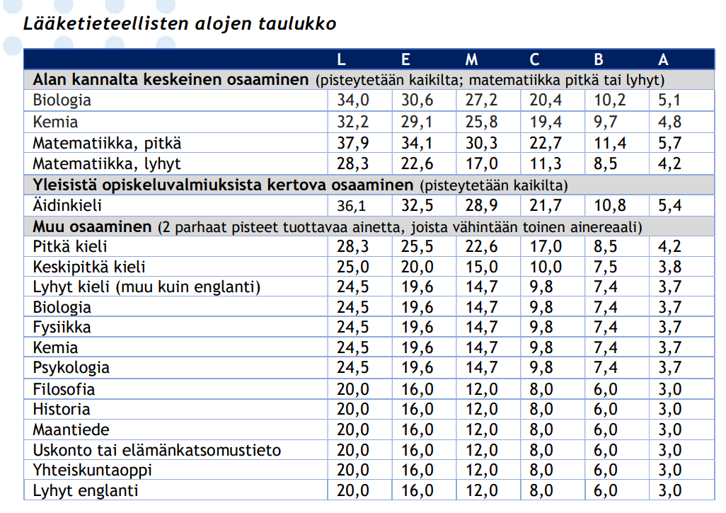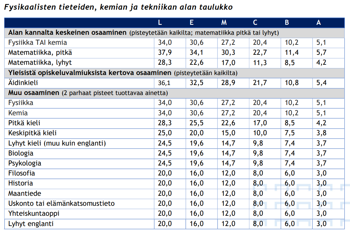Luonnosryhmä: “SYK-menetelmän ansiosta vähäinen opintopistemäärä ei tarkoita sitä, että kyseisen aineen kokeesta olisi helppo saada hyvä arvosana. Esimerkiksi keväällä 2022 terveystiedon laudaturin sai 4,4 % kirjoittajista, kun fysiikassa vastaava luku oli 8,8 %” (s. 14)