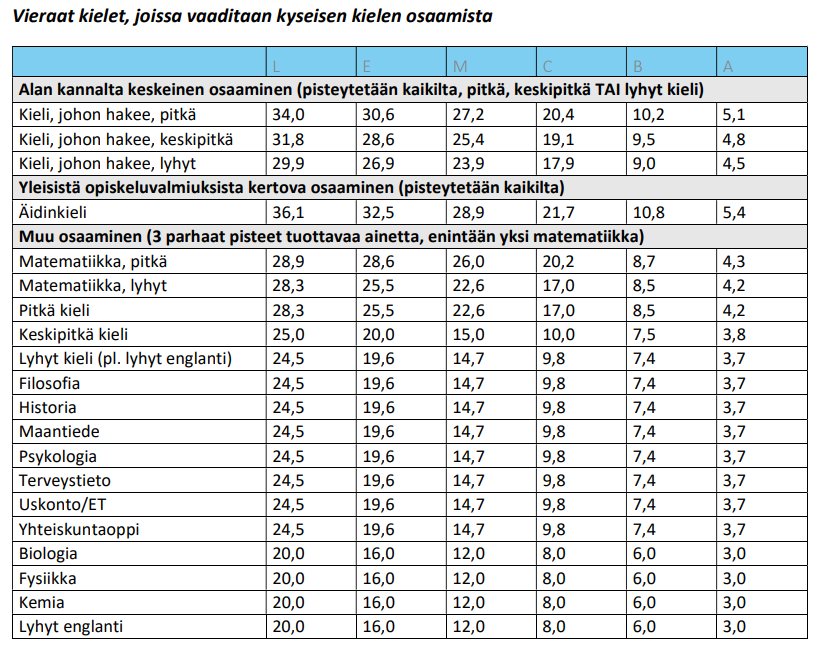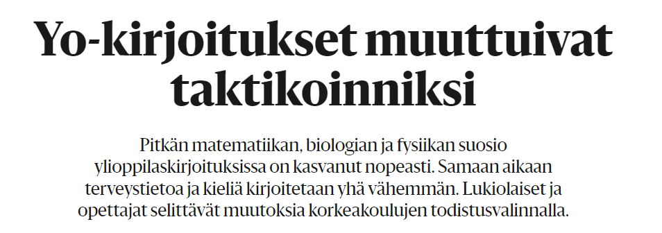 Luonnosryhmä: “Äidinkielestä hyvän arvosanan kirjoittaminen on myös vaikeampaa kuin useimmista muista aineista. Kevään 2022 ylioppilaskirjoituksissa äidinkielestä L:n tai E:n sai yhteensä 18,5 % kokelaista, kun esimerkiksi pitkästä matematiikasta L:n tai E:n sai 28,6 % …” (s. 17)