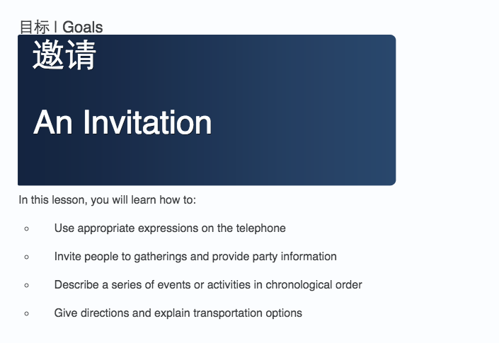 In this lesson, you will learn how to: Use appropriate expressions on the telephone Invite people to gatherings and provide party information Describe a series of events or activities in chronological order Give directions and explain transportation options