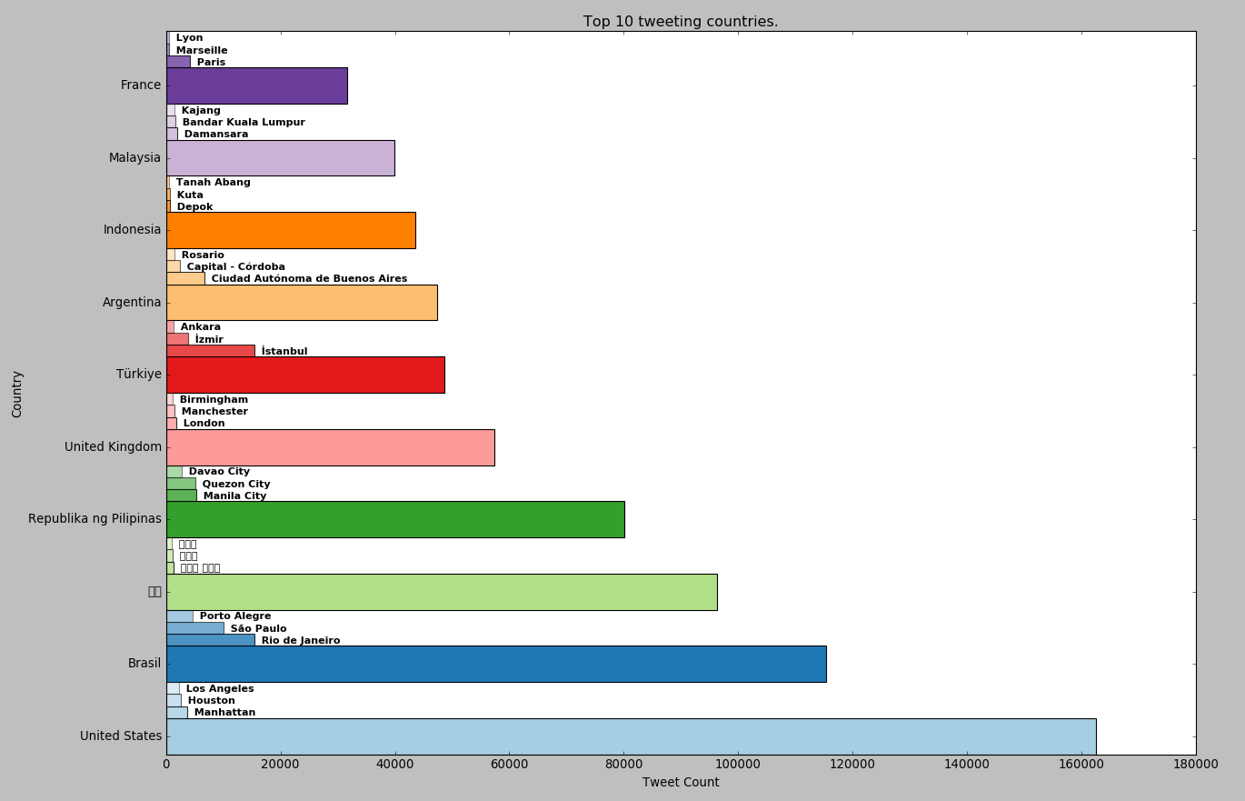# Get top 10 most tweeting countries