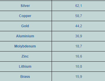 Cobre es 10^7 veces más conductivo que el agua de mar.