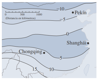 El mapa meteorológico de la figura muestra un mapa de contorno de la función de temperatura T(x,y) para China a las tres de la tarde del 28 de diciembre de 2004.