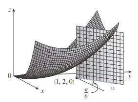 Entonces, el punto P(x0,y0,z0) reside en S. El plano vertical que pasa por P en la dirección de u interseca S en una curva C. La pendiente de la recta tangente T a C en el punto P es la razón de cambio de z en la dirección de u.