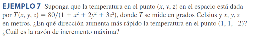 Suponga que tiene una función f de dos o tres variables y considere todas las posibles derivadas direccionales de f en un punto dado. Estas dan las razones de cambio de f en todas las direcciones posibles. Entonces, se pueden hacer estas preguntas: ¿en cuál de esas direcciones cambia más rápido f y cuál es la máxima razón de cambio?