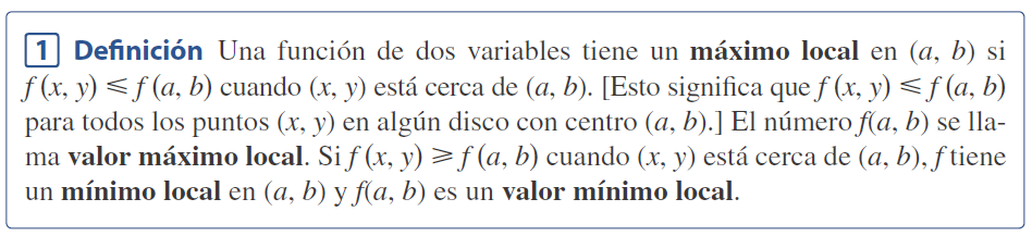 Uno de los principales usos de las derivadas ordinarias es encontrar valores máximos y mínimos (valores extremos). En esta sección se verá cómo usar derivadas parciales para localizar máximos y mínimos de funciones de dos variables.