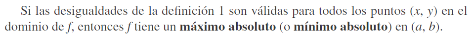 valores cercanos de f(x, y). El mayor de esos dos valores es el máximo absoluto. De igual manera, f tiene dos mínimos locales, donde (a, b) es menor que los valores cercanos. El menor de estos dos valores es el mínimo absoluto.
