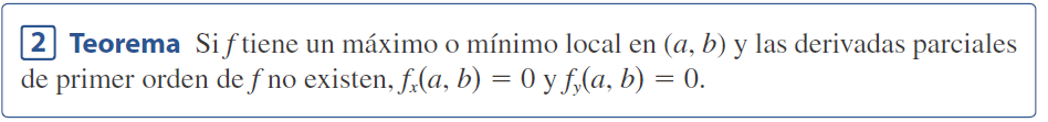 Un punto (a, b) se llama punto crítico (o punto estacionario) de f si fx(a, b)=0 y fy(a, b)=0, o si una de estas derivadas parciales no existe. El teorema 2 indica que si f tiene un máximo o mínimo local en (a, b), entonces (a, b) es un punto crítico de f.