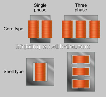 Un tipo de transformador consta de una pieza de acero rectangular, laminada, con los devanados enrollados sobre dos de los lados del rectángulo. Esta clase de construcción, conocido como transformador tipo núcleo, se ilustra en la figura.