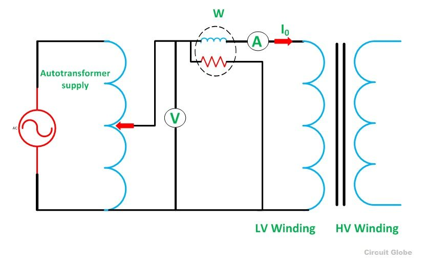 En la figura se puede ver un transformador que consta de dos bobinas de alambre enrollado alrededor del núcleo de un transformador. El transformador primario está conectado a una fuente de potencia de ca y el devanado secundario está abierto. La curva de histéresis del transformador se muestra en la figura superior derecha.