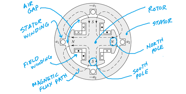 Las máquinas síncronas tienen dos circuitos eléctricos: el inductor y el inducido. Sin embargo, la principal diferencia respecto a las primeras está en que la disposición de los devanados está invertida,