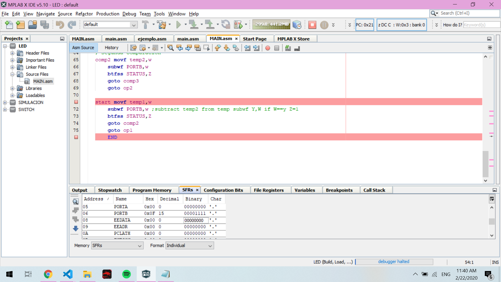 Se simulará el funcionamiento de un semáforo, en el puerto A bit 0 permanecerá 5 segundos encendidos, después hará un parpadeo de 0.5s se desactivará y activará el bit 1, el cual permanecerá 2 segundos encendido hará un parpadeo de 0.5s se desactivará y activará el bit 2 , el cual permanecerá 5 segundos encendido hará un parpadeo de 0.5s y repetirá la secuencia.