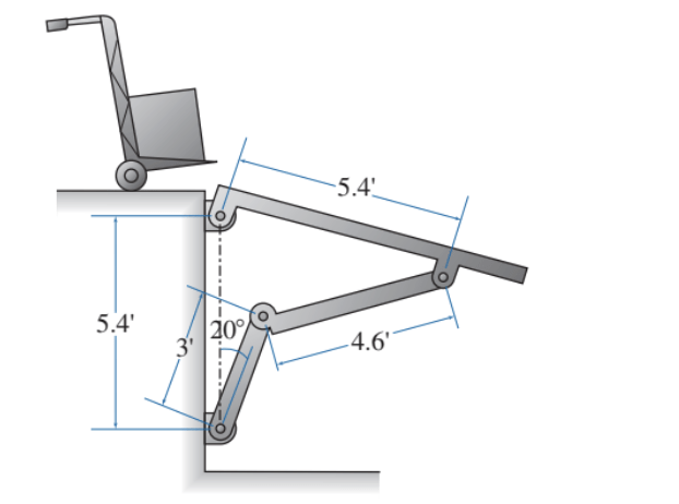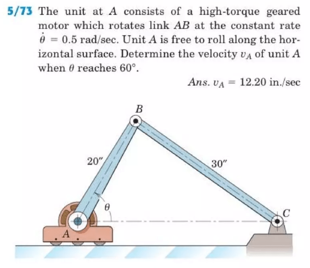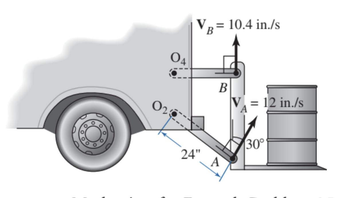 La figura ilustra el mecanismo para elevar carga de un camión repartidor. En este instante, el punto A tiene una velocidad de 12 in/s en la dirección mostrada, en tanto que el punto B tiene una velocidad de 10.4 in/s en la dirección mostrada.
