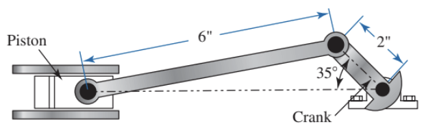Para el mecanismo compresor de la figura, use el método de velocidad relativa(polígono de velocidad) para determinar gráficamente la velocidad lineal del pistón, conforme la manivela gira a 1150 rpm en sentido horario.