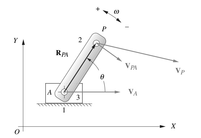 4. Se tiene un caso específico cuando se plantea la ecuación de velocidad de dos puntos de la misma barra en una manivela, ya que la velocidad en uno de sus nodos (Vp) es igual a la velocidad relativa del nodo vista desde el pivote Ox (Vp/Ox), el cual al estar siempre fijo es de magnitud nula: