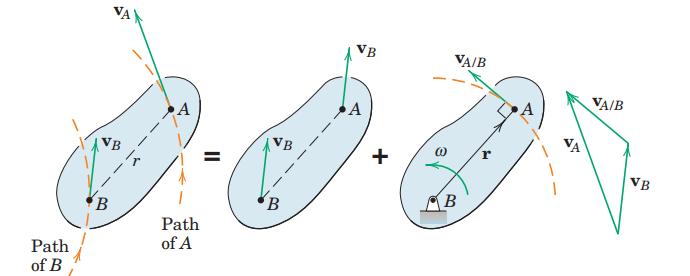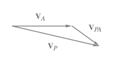 Por otra parte, la velocidad relativa (Vp/q) puede calcularse mediante la expresión Vp/q=(ωp/q)(rp/q), ya que siempre es de trayectoria circular y, por tanto, perpendicular al radio de giro rp/q.