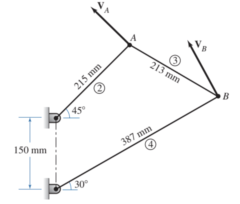 En la figura se presenta el diagrama cinemático de un mecanismo de cuatro barras. En el instante mostrado, VA = 800 mm/s VB= 888 mm/s.Determine gráficamente la velocidad relativa del punto B con respecto al punto A. Determine también la velocidad angular de los eslabones 2 y 4.