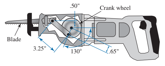 Para la sierra reciprocante mostrada en la figura, use el método de velocidad relativa para determinar gráficamente la velocidad lineal de la cuchilla, conforme la rueda de la manivela gira a 1500 rpm en sentido antihorario.