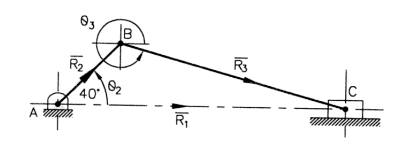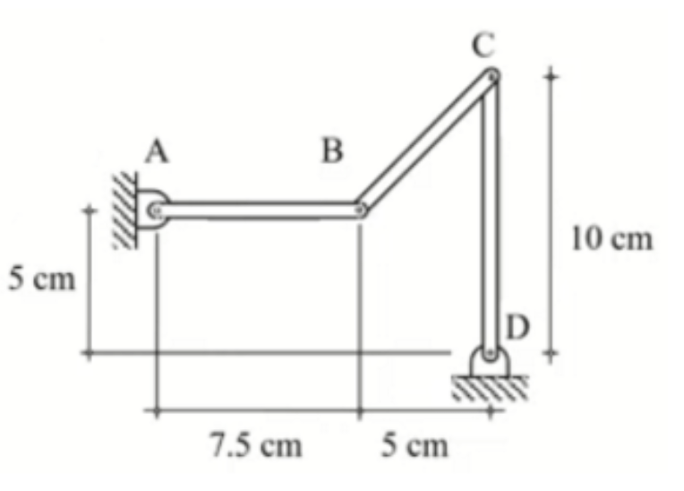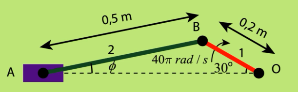 El mecanismo de la figura representa el diagrama cinemático de un mecanismo manivela-oscilador. La manivela 2 se mueve a una velocidad constante de 5 rad/s, cmr (en sentido contrario al movimiento de las manecillas del reloj).