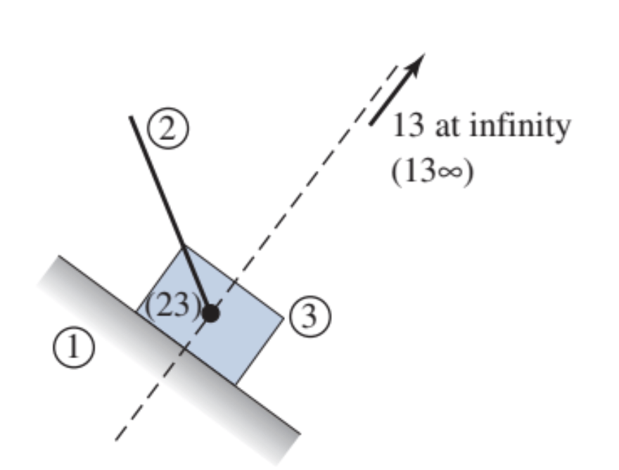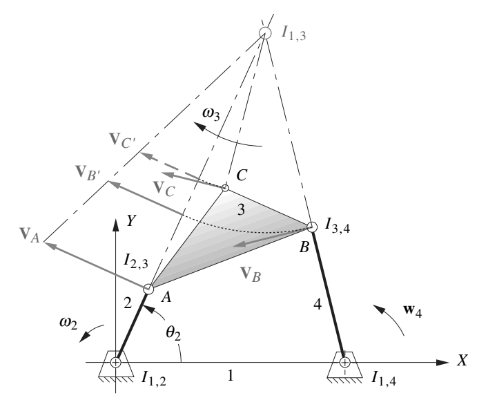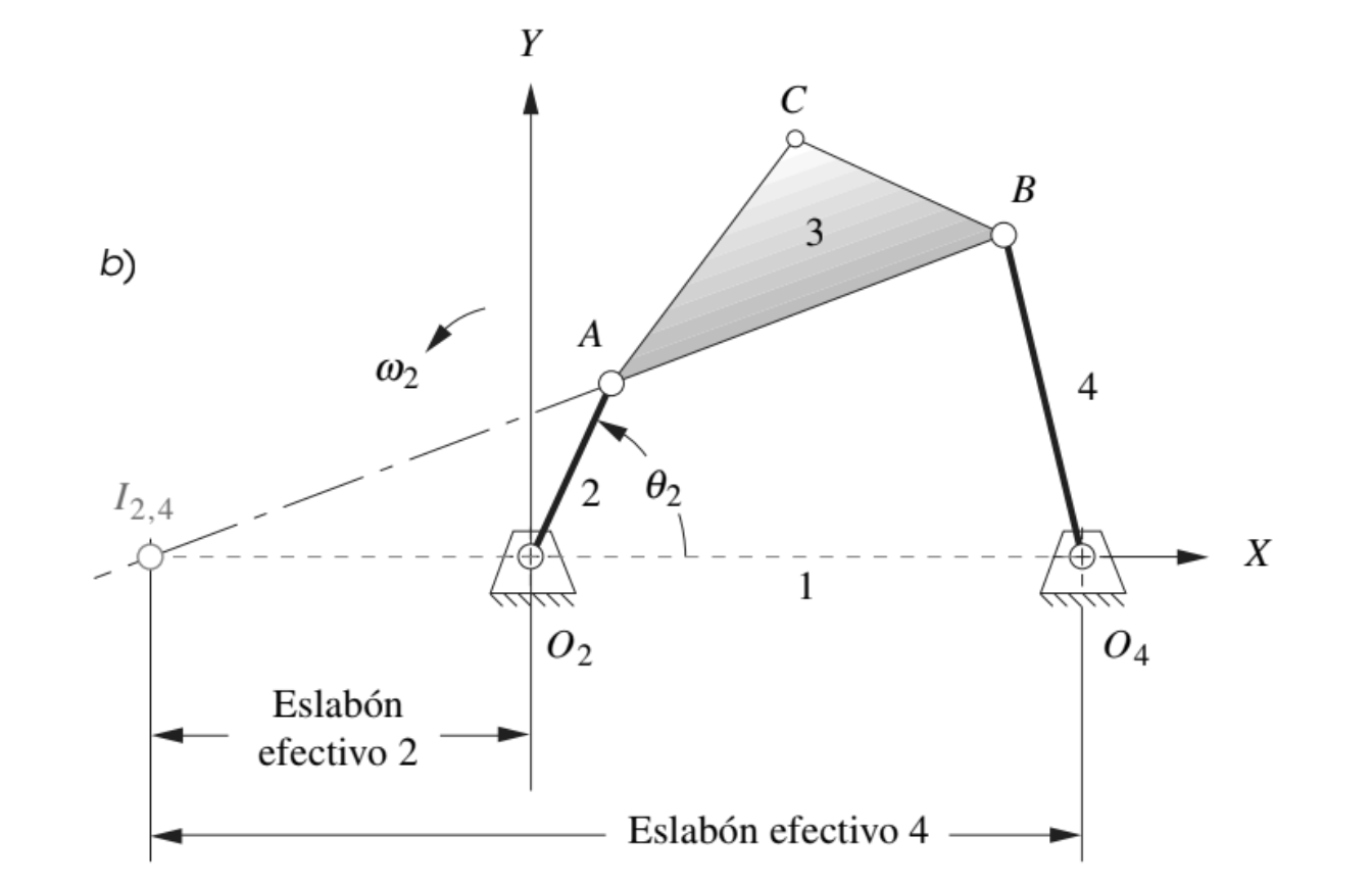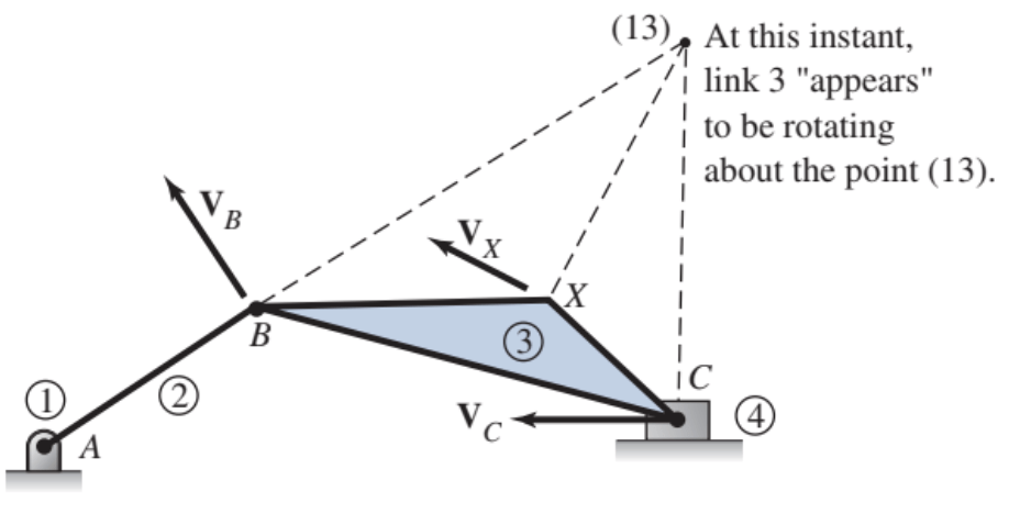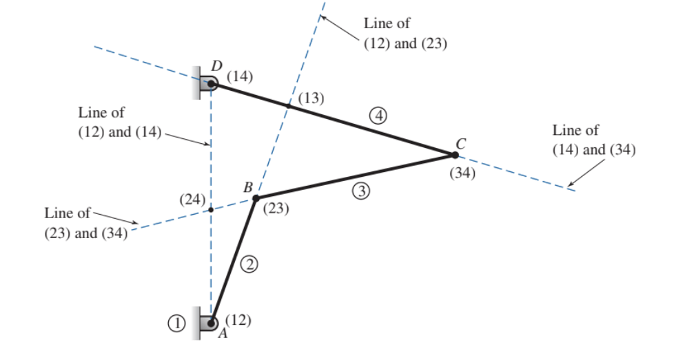 Por ejemplo, si se asigna el elemento 1 al eslabón fijo, entonces los CIV de los eslabones 1, i, j se encuentran en la llamada línea de Kennedy, como se muestra en la figura.