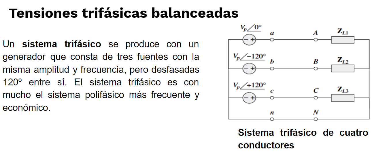Un sistema trifásico habitual consta de tres fuentes de tensión conectadas a cargas mediante tres o cuatro conductores (o líneas de transmisión). Un sistema trifásico equivale a tres circuitos monofásicos.