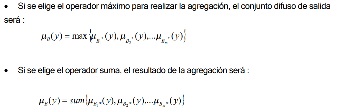 Una vez evaluadas todas las reglas y obtenidos los conjuntos difusos de salida modificados, hay que realizar la agregacion de todas las reglas para obtener un resultado unico de la actuacion de todas ellas.