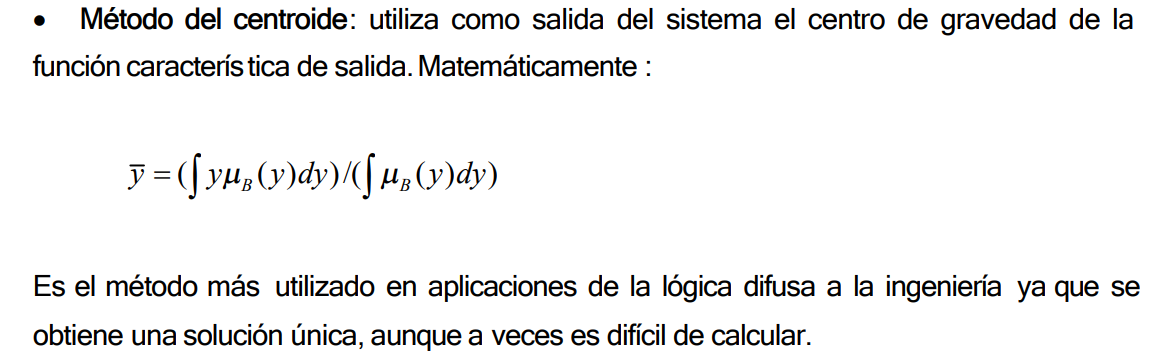 Es el método mas utilizada en aplicaciones de la lógica difusa a la ingeniería ya que se obtiene una solución única , aunque a veces es difícil de calcular.