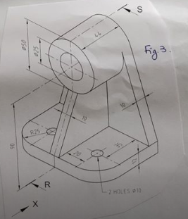 Refer to the corresponding 3D drawing shade of the object to construct which belongs to the chosen front view full section. This is chosen due to limited hidden lines and the best view of the overall shape.