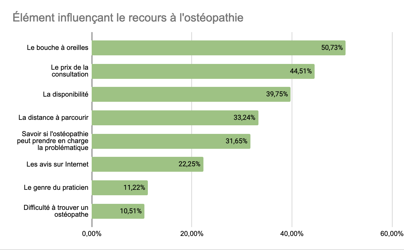 D'après une étude de la FedOsoli en 2023, les patient·e·s ont recours aux recommandations via le bouche à oreille pour choisir leur ostéopathe dans ~50% des cas !