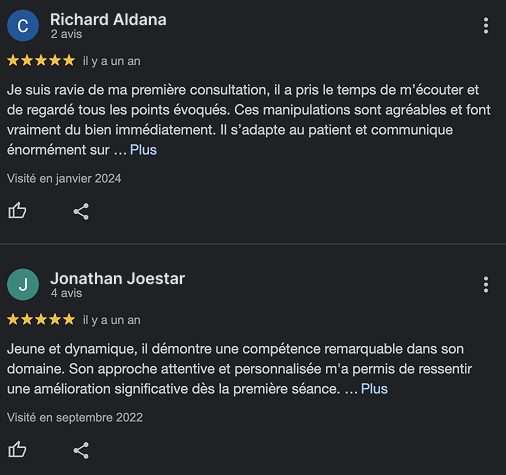 L'ostéo a l'air très sympathique et les gens ont été soulagés et ils ont pris le temps de laisser un avis détaillé, c'est bon signe.