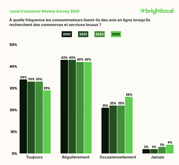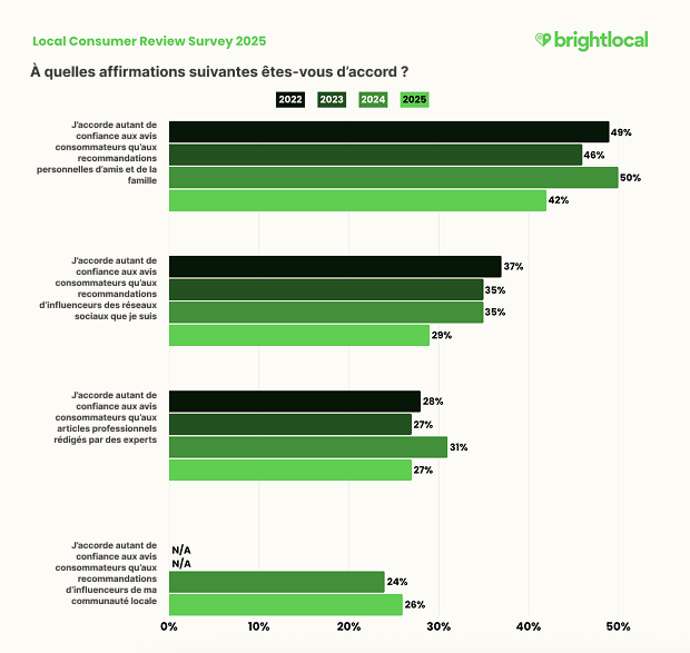 L'étude de BrightLocal nous dit que 42% de gens mettent au même niveau de confiance, l'avis d'un proche et d'un avis Google.