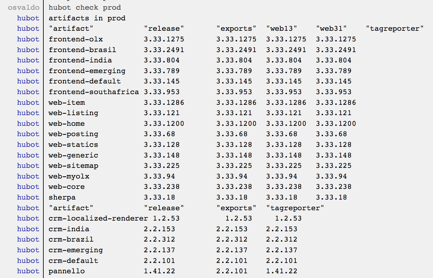 msg.send "artifacts in "+env+"\n" + stdout + "\n" + stderrCODE for hubot check prod