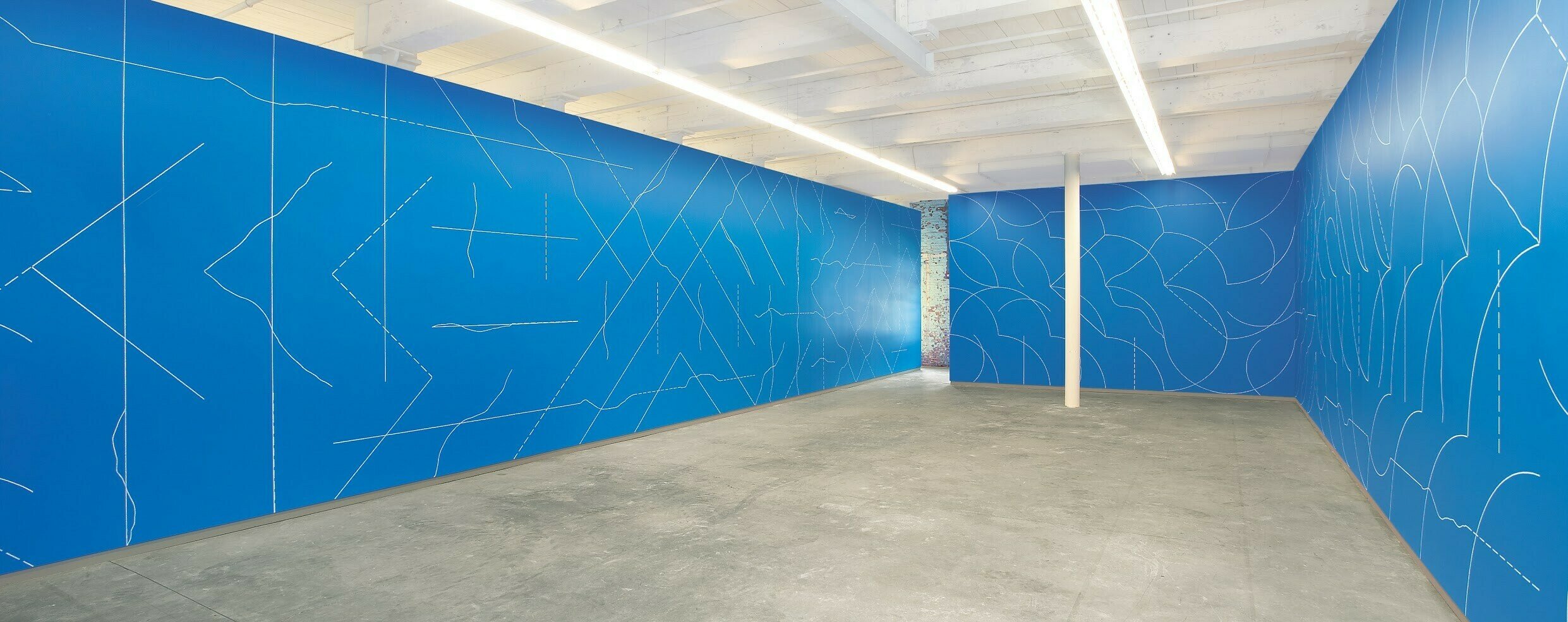 On blue walls, all two-part combinations of white arcs from corners and sides, and white straight, not straight, and broken lines within a 36-inch (90 cm) grid.