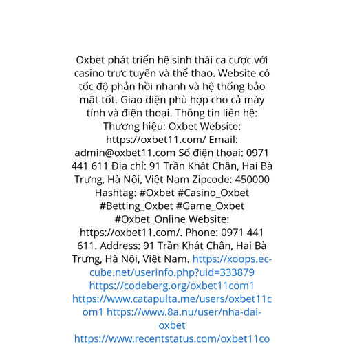 Website: https://oxbet11.com/. Oxbet phát triển hệ sinh thái ca cược với casino trực tuyến và thể thao. Website có tốc độ phản hồi nhanh và hệ thống bảo mật tốt. Giao diện phù hợp cho cả máy tính và điện thoại. Thông tin liên hệ: Thương hiệu: Oxbet