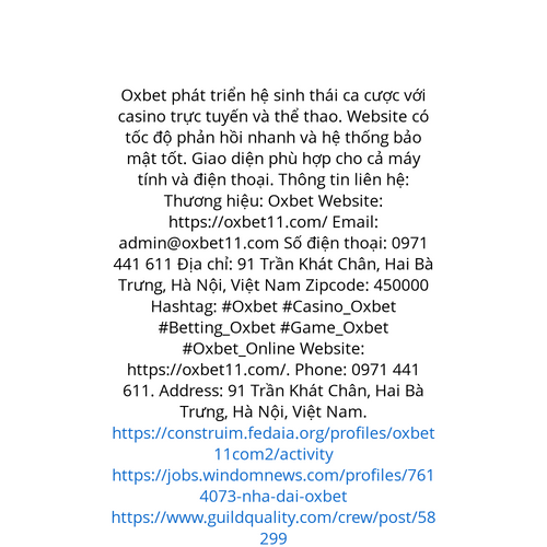 Website: https://oxbet11.com/. Oxbet phát triển hệ sinh thái ca cược với casino trực tuyến và thể thao. Website có tốc độ phản hồi nhanh và hệ thống bảo mật tốt. Giao diện phù hợp cho cả máy tính và điện thoại. Thông tin liên hệ: Thương hiệu: Oxbet