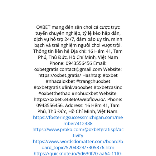 Website: https://oxbet-343e69.webflow.io/. OXBET mang đến sân chơi cá cược trực tuyến chuyên nghiệp, tỷ lệ kèo hấp dẫn, dịch vụ hỗ trợ 24/7, đảm bảo uy tín, minh bạch và trải nghiệm người chơi vượt trội. Thông tin liên hệ Địa chỉ: 16 Hẻm 41, Tam Phú