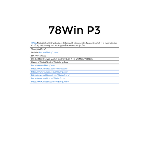 78Win Nhà cái cá cược trực tuyến chất lượng, 78 win cung cấp đa dạng trò chơi, tỷ lệ cược hấp dẫn và hỗ trợ khách hàng 24/7. Tham gia để nhận ưu đãi hấp dẫn! Website: https://78winp3.com/ SĐT: 0875690666
