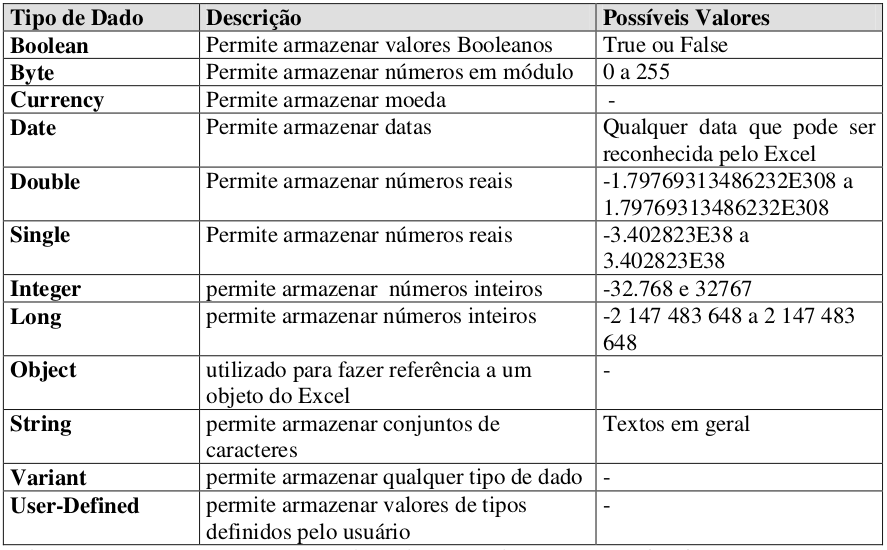 - A declaração de uma variável em VBA é feita usando o comando Dim em qualquer local do procedimento, porém é comum os programadores declararem todas as variáveis logo no início do procedimento.