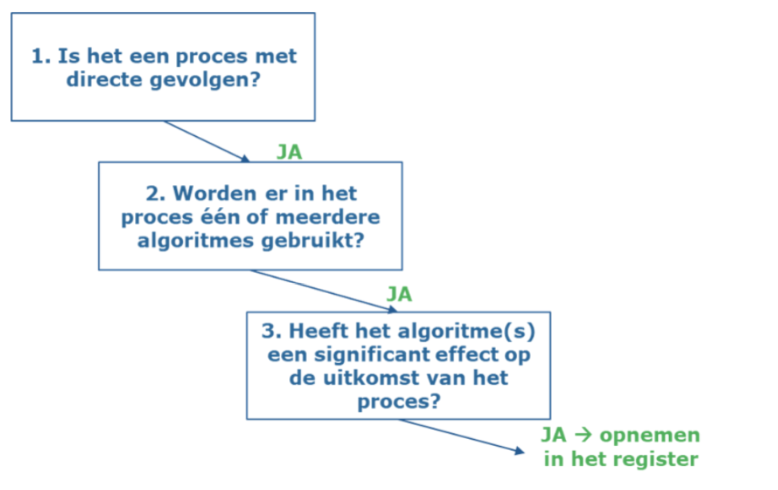 Wanneer onderstaande drie vragen met ‘ja’ te beantwoorden zijn dan betekent dit dat ze in ieder geval onder categorie B opgenomen kunnen worden in het Algoritmeregister.