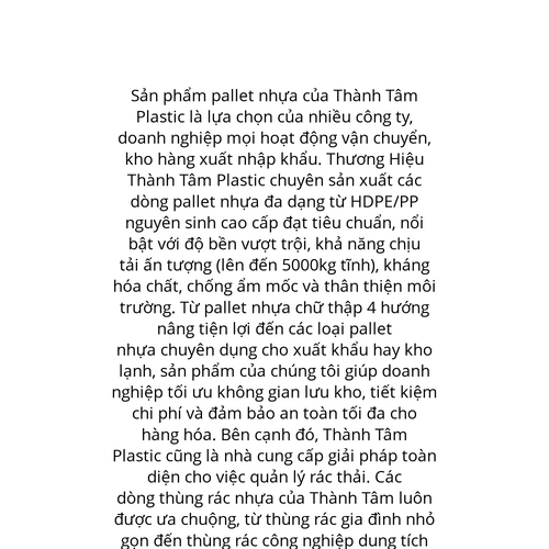 Website: https://thanhtamplastic.com.vn/pallet-nhua Sản phẩm pallet nhựa của Thành Tâm Plastic là lựa chọn của nhiều công ty, doanh nghiệp mọi hoạt động vận chuyển, kho hàng xuất nhập khẩu. Thương Hiệu Thành Tâm Plastic chuyên sản xuất