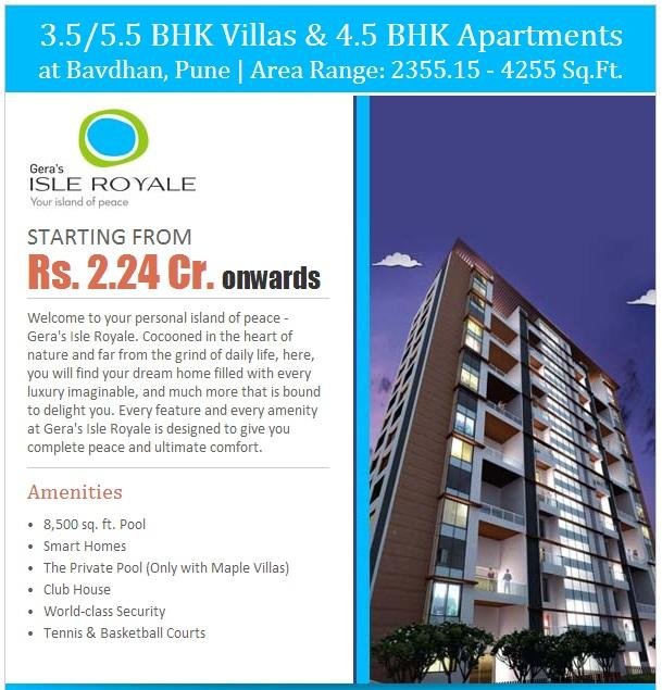 Gera Isle Royale is fabulous luxury villas at Bavdhan in Pune which is offers 3, 4 & 5 BHK Homes. Gera's Isle Royale is the result of the modern art of design and building to offer you and your family members for most stylish and lifelong design.