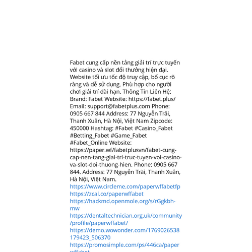 Website: https://paper.wf/fabetplusvn/fabet-cung-cap-nen-tang-giai-tri-truc-tuyen-voi-casino-va-slot-doi-thuong-hien. Fabet cung cấp nền tảng giải trí trực tuyến với casino và slot đổi thưởng hiện đại. Website tối ưu tốc độ truy cập, bố cục rõ ràng v