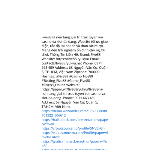 Website: https://paper.wf/five88ryukyu/five88-la-nen-tang-giai-tri-truc-tuyen-voi-casino-va-slot-da-dang. Five88 là nền tảng giải trí trực tuyến với casino và slot đa dạng. Website tối ưu giao diện, tốc độ tải nhanh và thao tác mượt. Mang đến trải ng