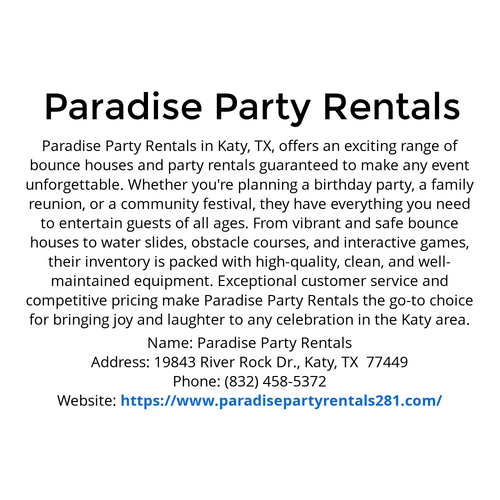 https://www.paradisepartyrentals281.com/ Paradise Party Rentals in Katy, TX: Top choice for exciting bounce houses & party gear. Make events unforgettable with great service & prices!