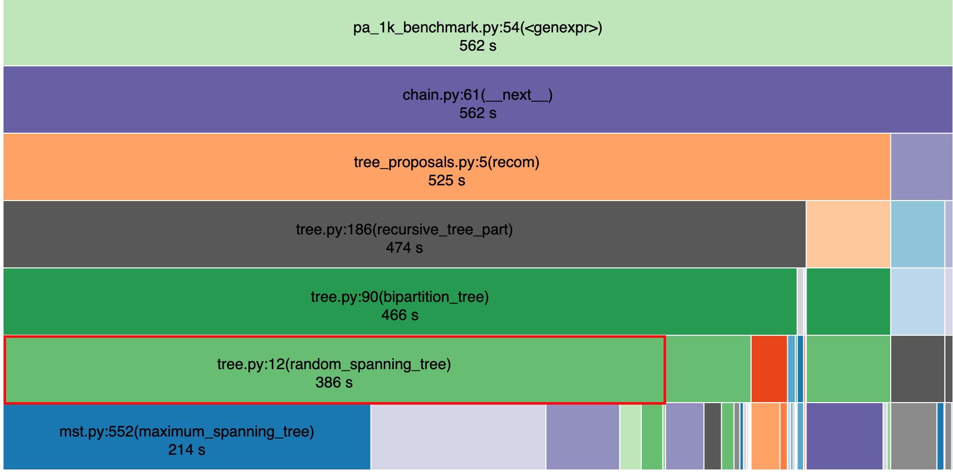 For a typical ReCom run on Pennsylvania, random spanning tree operations take up ~70% of runtime.